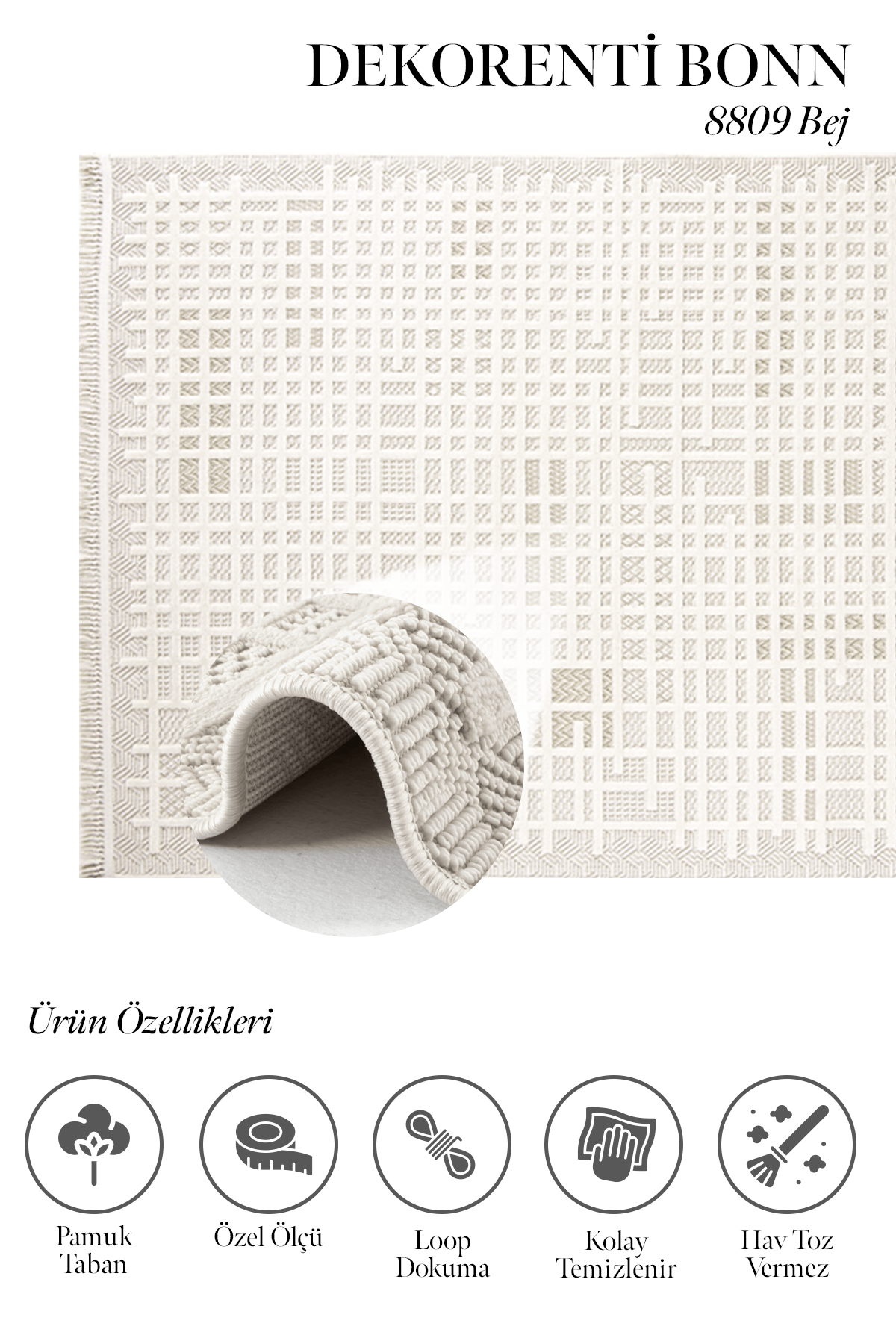 Bonn Serisi Dekorenti markasının geometrik desenli modellerinden biridir. Desenlerinde her mobilyaya ve zemine uyum sağlayacak krem, gri ve bej renk tonları hakimdir. Modern evler, genç odaları için uygun bir modeldir. Hafif bir halı olması bakımından kullanımı konforludur. Ayrıca Bonn serisi tozumaz, ve hav tüy çıkarmaz özelliklere sahiptir. Kolay temizlenir olması bakımından avantaj sağlar. Yan kenarları overlok dikişlidir. Bonn; pamuk tabanlı, örgü saçaklı, iplik türü polyester olan makine halısıdır.