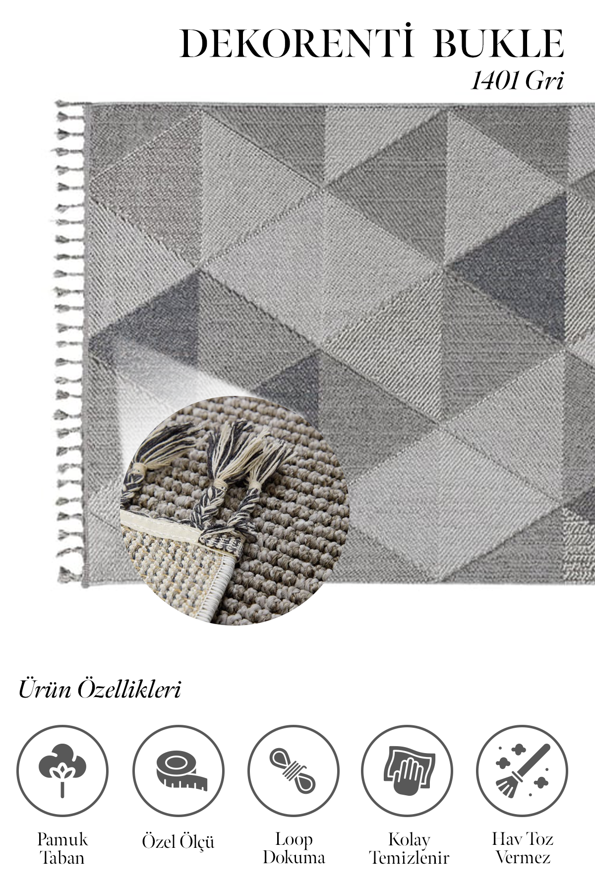Loop dokuma şekliyle üretilen jüt tabanlı Bukle serisi diğer serilerden farklılaşır. Spor desen türündedir ve yüzeyindeki geometrik şekilli desenleri ile dikkat çekicidir. Üstelik Bukle Serisi Dekorenti Halı markasının ekonomik halı serilerinden biridir. 67.200 ilme ucu sıklığında 7mm hav yüksekliğindedir. Ayrıca polip iplik türünde olmasından dolayı tozumaz ve antialerjik özelliğe sahiptir. Artı olarak örgü saçakları halıya değer katar. Yan tarafları overlok dikişlidir. Desenlerindeki gri, krem, bej, sarı ve mavi tonda zengin renk seçenekleri seçiminizde size avantaj sağlar. Hafifliği ile de size kolaylık sağlayan farklı tarz Bukle serisiyle, evinizde yeniden şekillendirin ve kendinizi mutlu edin.