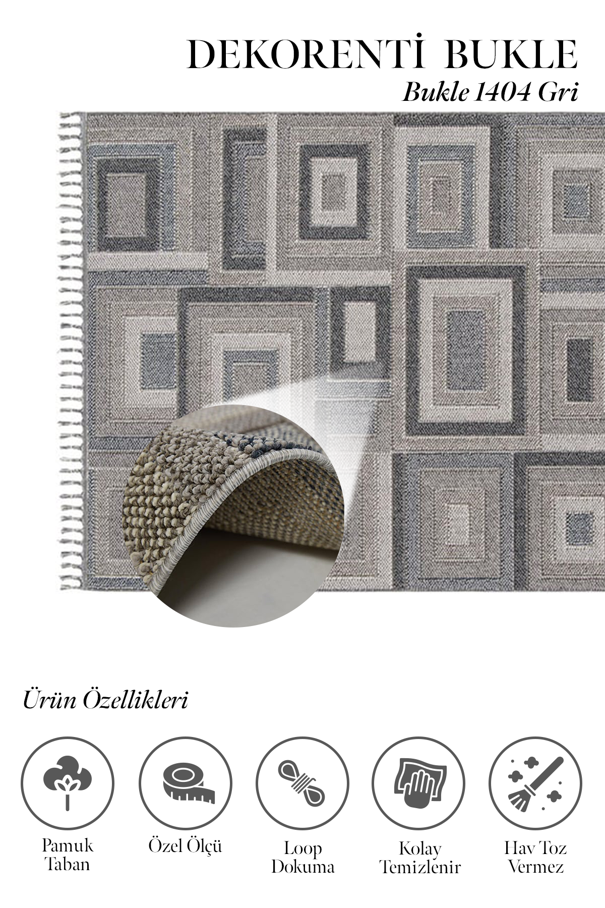 Loop dokuma şekliyle üretilen jüt tabanlı Bukle serisi diğer serilerden farklılaşır. Spor desen türündedir ve yüzeyindeki geometrik şekilli desenleri ile dikkat çekicidir. Üstelik Bukle Serisi Dekorenti Halı markasının ekonomik halı serilerinden biridir. 67.200 ilme ucu sıklığında 7mm hav yüksekliğindedir. Ayrıca polip iplik türünde olmasından dolayı tozumaz ve antialerjik özelliğe sahiptir. Artı olarak örgü saçakları halıya değer katar. Yan tarafları overlok dikişlidir. Desenlerindeki gri, krem, bej, sarı ve mavi tonda zengin renk seçenekleri seçiminizde size avantaj sağlar. Hafifliği ile de size kolaylık sağlayan farklı tarz Bukle serisiyle, evinizde yeniden şekillendirin ve kendinizi mutlu edin.