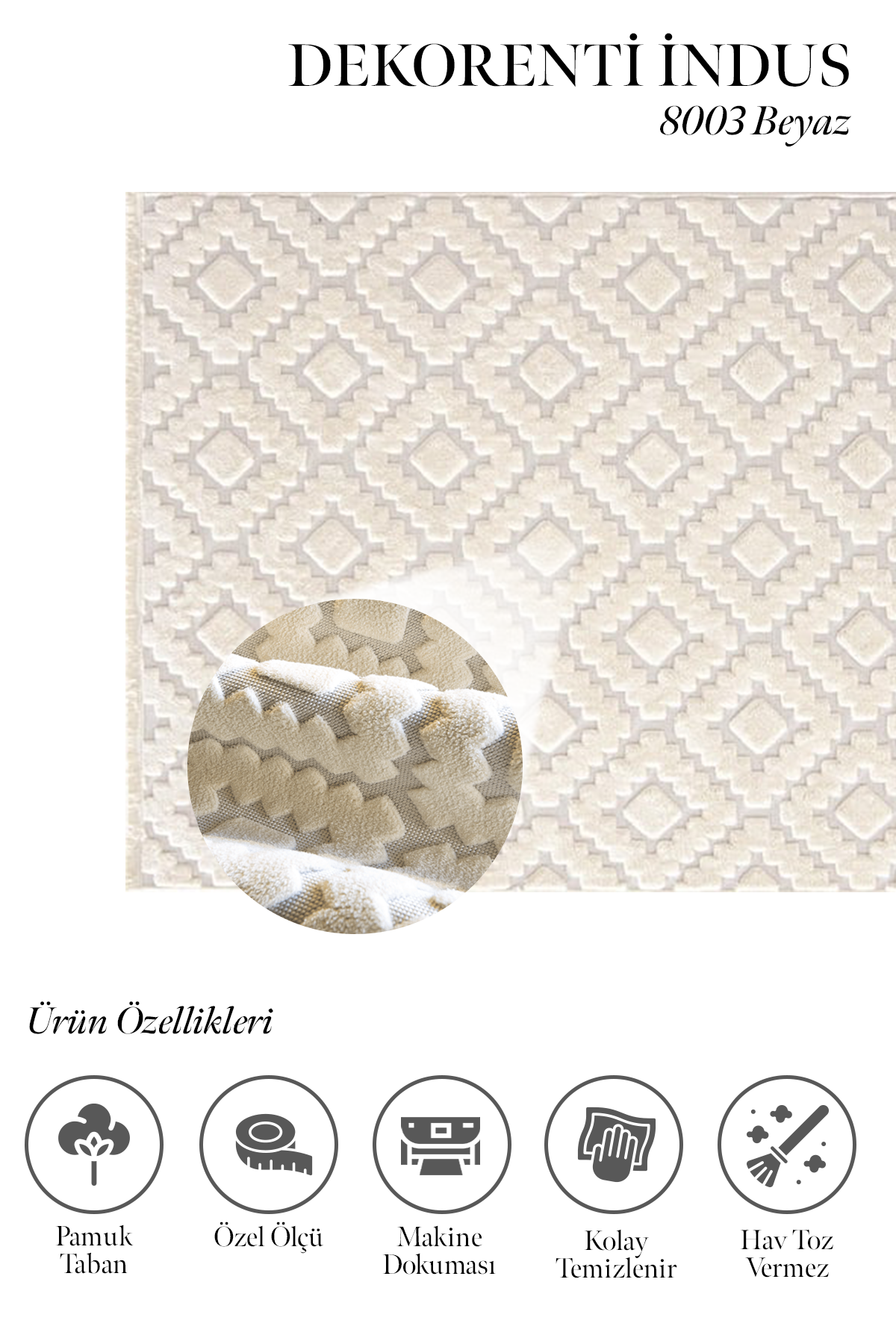 İndus Serisi Dekorenti markasının geometrik desenli modelidir. Desenlerinde her mobilyaya ve zemine uyum sağlayacak krem, gri, beyaz ve vizon gibi zengin renk tonları hakimdir. Ayrıca tozumaz, ve hav tüy çıkarmaz özelliklere sahiptir. Kolay temizlenir olması bakımından avantaj sağlar. Yan kenarları ise overlok dikişlidir. İndus pamuk tabanlı, spor saçaklı, iplik türü polyester olan makine halısıdır.