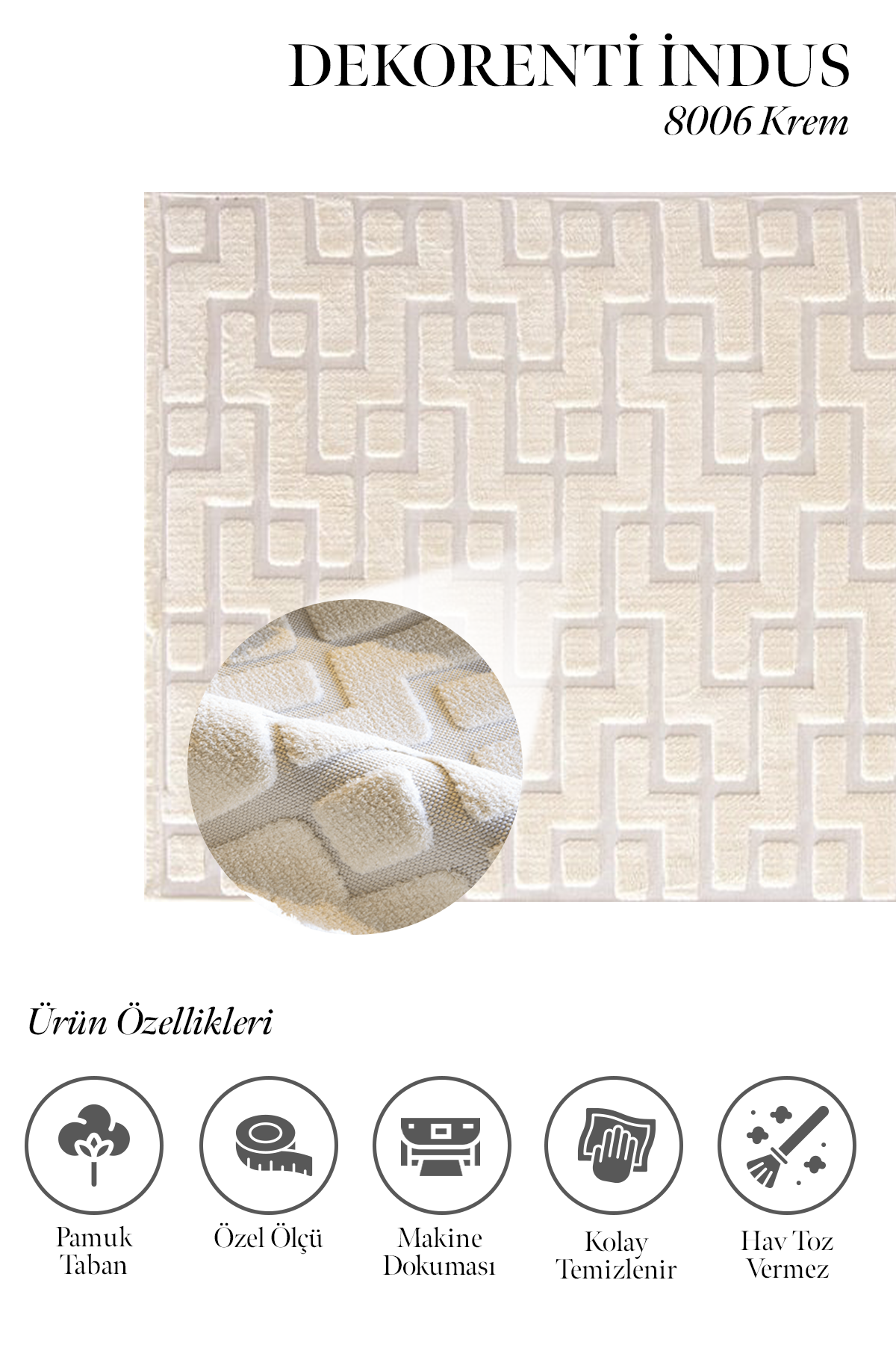 İndus Serisi Dekorenti markasının geometrik desenli modelidir. Desenlerinde her mobilyaya ve zemine uyum sağlayacak krem, gri, beyaz ve vizon gibi zengin renk tonları hakimdir. Ayrıca tozumaz, ve hav tüy çıkarmaz özelliklere sahiptir. Kolay temizlenir olması bakımından avantaj sağlar. Yan kenarları ise overlok dikişlidir. İndus pamuk tabanlı, spor saçaklı, iplik türü polyester olan makine halısıdır.