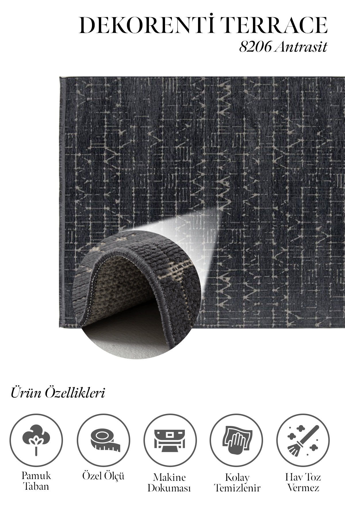 Terrace serisi Dekorenti markasının modern tarzda çizgili desenli halı modelidir. Kaymaz tabanlı olması halının en önemli özelliklerinden biridir. Bu açıdan evin her alanında rahatlıkla kullanılabilir. Özellikle hol, antre, koridor için ideal bir halıdır. Ayrıca modern çizgilerinden dolayı salon, oturma odası ve yatak odasında da tercih edilir. Üstelik kolay temizlenir, tozumuz ve hav tüy çıkarmaz. Terrace serisinde gri, beyaz, antrasit renk tonları hakimdir. Terrace kısa spor saçaklı, yan kenarları overlok dikişli ve iplik türü pamuk-polyester olan makina halısıdır.