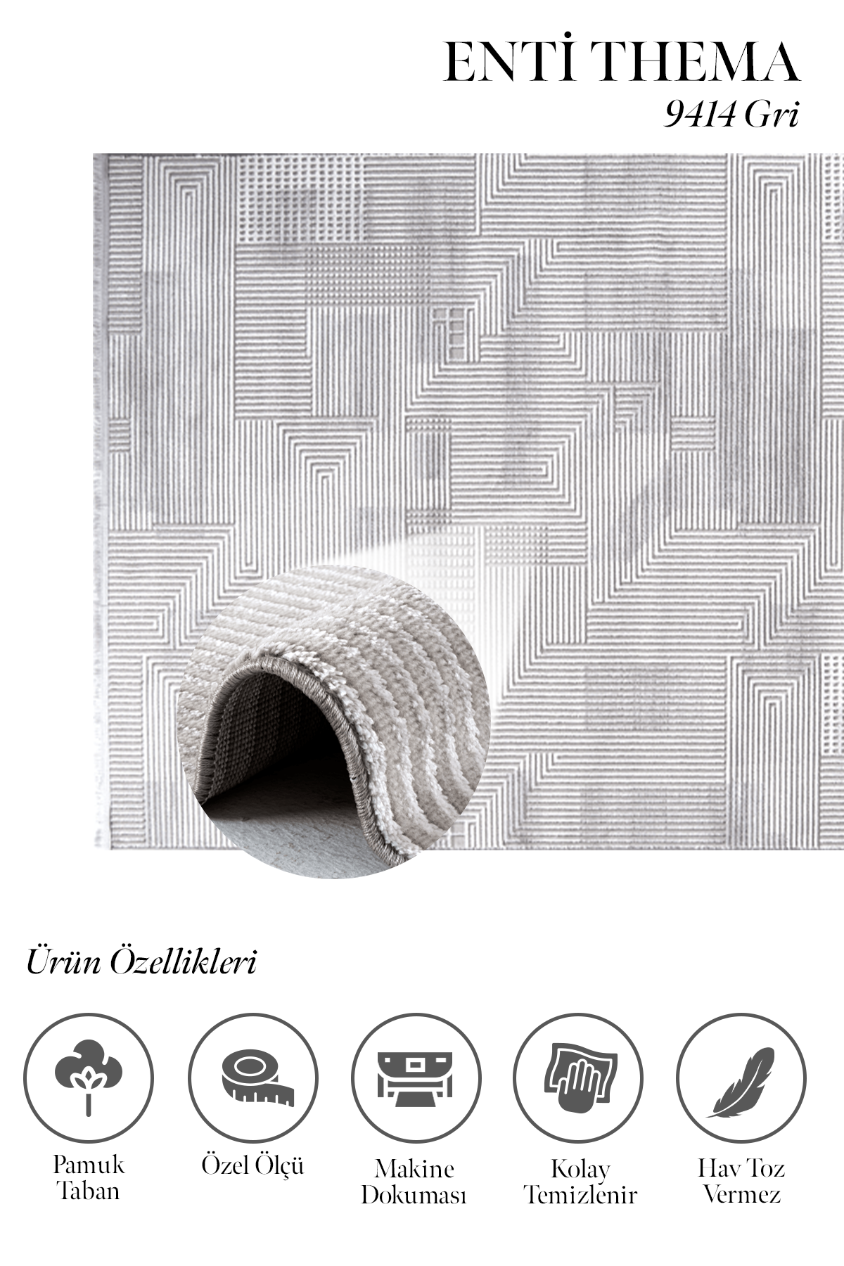 Thema 9414 Gri – Minimalist Çizgi Detaylı Gri Salon Halısı