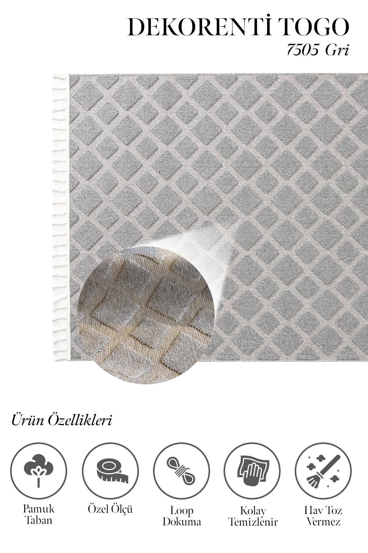 Togo Serisi Dekorenti markasının hafifliği ve boyutlu desenleri ile ön plana çıkan modellerindendir. Ayrıca çok fazla çeşidi olan geometrik desenlere sahip Togo serisi ile evinize uygun halıyı daha kolay seçebilirsiniz. Desenlerinde gri, bej, beyaz ve antrasit renklere sahiptir. Püsküllü saçaklarıyla halıya şık ve dekoratif bir görüntü verir. Yan kenarları overlok dikişlidir. Togo jüt tabanlı, iplik türü polip olan makine halısıdır.