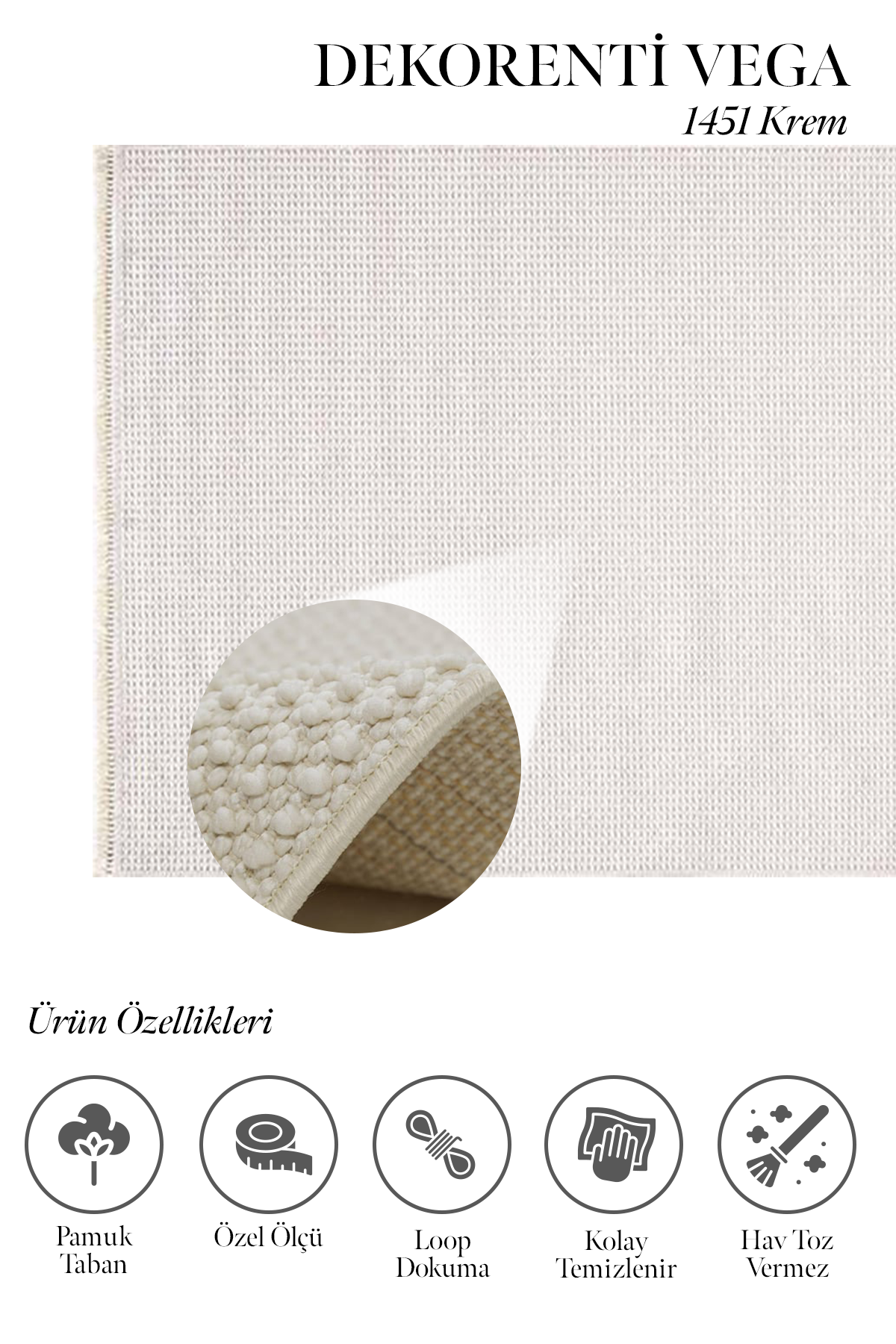 Vega Serisi hav ipi polip olan pamuk tabanlı, sisal&loop dokuma şekliyle dokunan bir makina halısıdır. Parlak yüzeyi olmasından dolayı halıya güzel bir görünüm verir. Neme- küfe, kire ve lekeye dayanıklıdır, ve temizliği kolaydır. Bunlara ek olarak keçelenme, tüylenme daha az görülür. Ayrıca dekoratif bir halıdır ve antialerjiktir. Üstelik Vega serisi dokumasında evlerde çok tercih edilen krem, vizon ve gri tonlarında renkler kullanılmıştır. Vega hem genç ve spor desen türündedir hem de sade düz renkli, geometrik şekilli ve saçaklı halılardır. Hav yüksekliği 7 mm. dir. ve 67.200 ilme ucu sıklığındadır, yan kenarları overlok dikişlidir. Evin her alanında kullanılır. Özellikle kış bahçesi, kapalı balkon, hol, antre, koridor için idealdir. Dekorenti halı markasının yeni serisi Vega, sadeliği sevenler için iyi bir seçenektir.