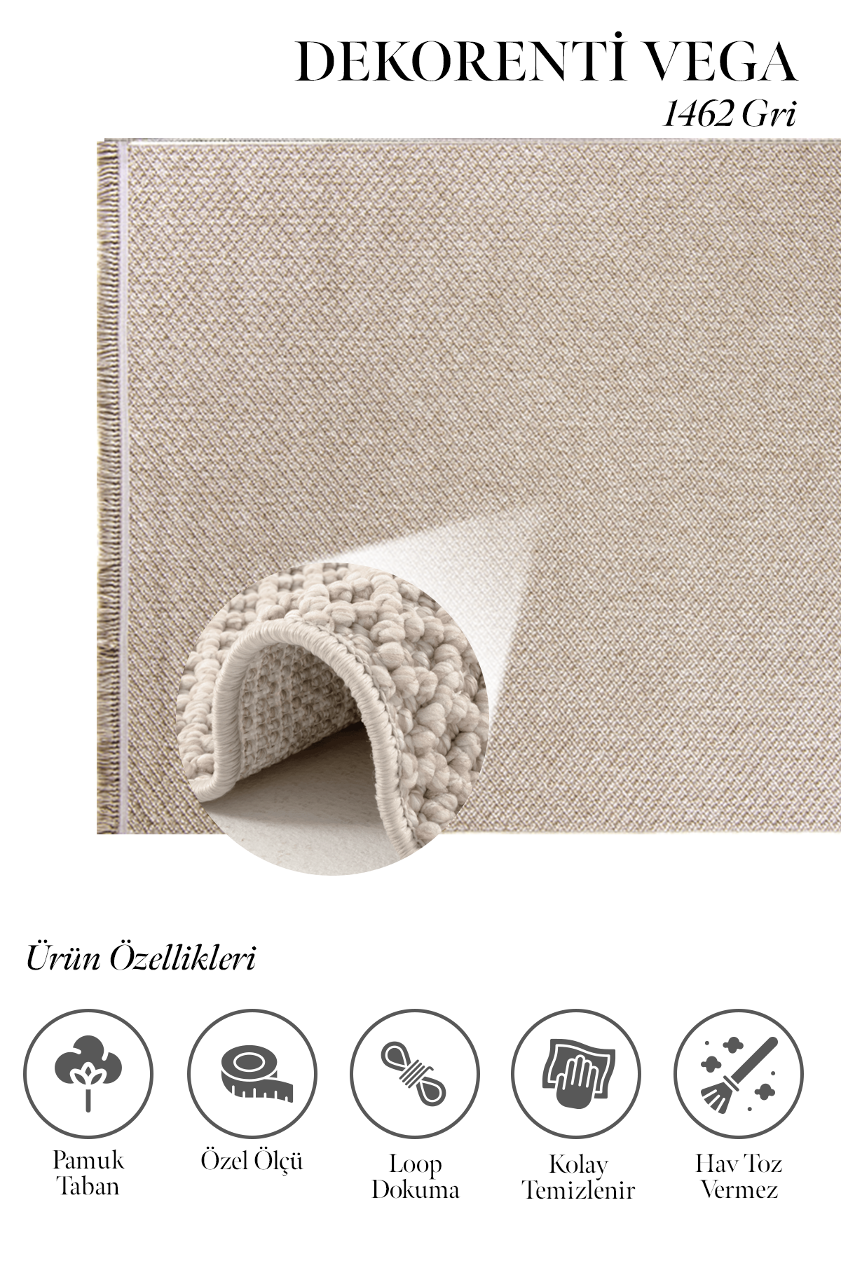 Vega Serisi hav ipi polip olan pamuk tabanlı, sisal&loop dokuma şekliyle dokunan bir makina halısıdır. Parlak yüzeyi olmasından dolayı halıya güzel bir görünüm verir. Neme- küfe, kire ve lekeye dayanıklıdır, ve temizliği kolaydır. Bunlara ek olarak keçelenme, tüylenme daha az görülür. Ayrıca dekoratif bir halıdır ve antialerjiktir. Üstelik Vega serisi dokumasında evlerde çok tercih edilen krem, vizon ve gri tonlarında renkler kullanılmıştır. Vega hem genç ve spor desen türündedir hem de sade düz renkli, geometrik şekilli ve saçaklı halılardır. Hav yüksekliği 7 mm. dir. ve 67.200 ilme ucu sıklığındadır, yan kenarları overlok dikişlidir. Evin her alanında kullanılır. Özellikle kış bahçesi, kapalı balkon, hol, antre, koridor için idealdir. Dekorenti halı markasının yeni serisi Vega, sadeliği sevenler için iyi bir seçenektir.